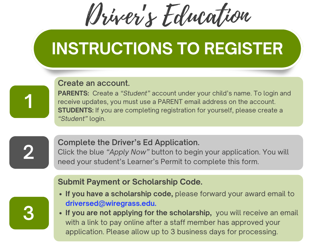 *Students who have a scholarship through GDEC, should enter their scholarship code on their application and forward their award email to driversed@wiregrass.edu.