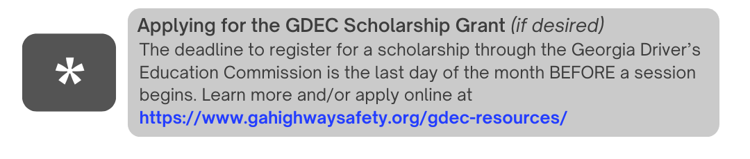 Scholarship Availability: Students ages 15 through 17 can apply for a scholarship through the Georgia Driver's Education Commission. (Read more here!)